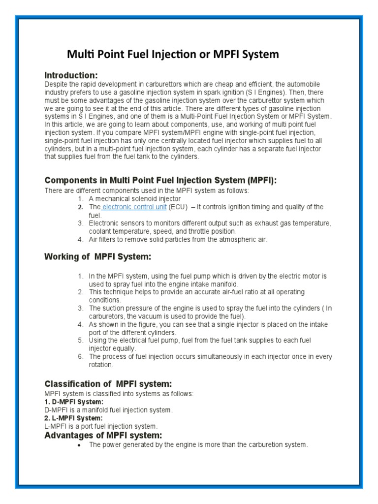 Multi Point Fuel Injection System (Mpfi) Download Free PDF Fuel Injection Internal Multi-Point Fuel Injection (Mpfi) It is a more efficient and. Components of an mpfi system; All these terms refer to the newer generation petrol injection systems. All these are the types of fuel injection systems which the gasoline or petrol fuel engines mainly use. Multi-Point Fuel Injection (Mpfi).